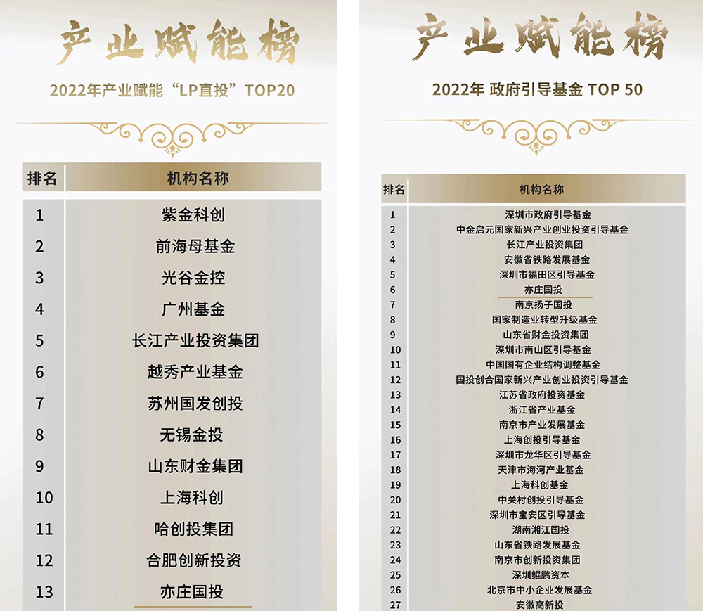 12月28日-29日,“投中2022年有限合夥人榜單”和LP智庫“2022 LP/GP産業賦能(néng)榜單”相繼揭曉,亦莊國(guó)投憑借雄厚實力、專業運營與優異表現,榮獲2022年度投中“中國(guó)最受GP關注的母基金TOP10”、“中國(guó)最佳母基金TOP30”和LP智庫“産業賦能(néng)LP直投TOP20”、“政府引導基金TOP50”。