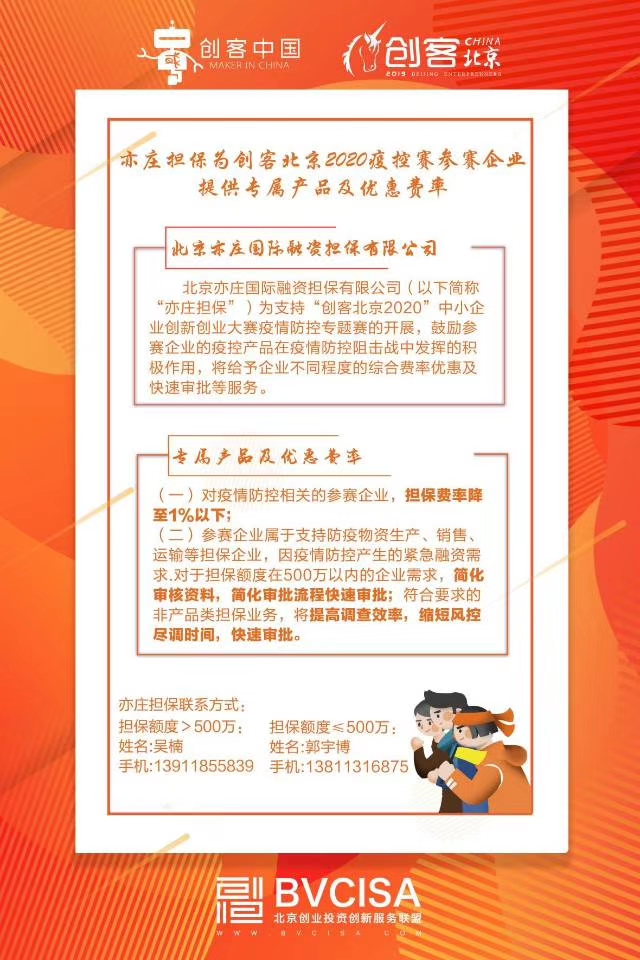 爲深入貫徹落實北京市促進(jìn)中小微企業發(fā)展“16條”措施和北京經(jīng)開(kāi)區支持企業控疫情穩增長(cháng)“10條”措施文件精神,加強疫情防控相關企業融資擔保服務保障,亦莊擔保公司與“創客北京2020”組委會(huì)、北京創業投資創新服務聯盟建立合作,支持“創客北京2020”中小企業創新創業大賽疫情防控專題賽,爲參賽項目提供“亦企戰疫”産品專屬服務,從而降低企業融資成(chéng)本、加快審批速度,助力診斷試劑、藥物疫苗、防護裝置、器械裝備、大數據監測分析等疫情防控領域創新技術、産品和服務加快發(fā)展。